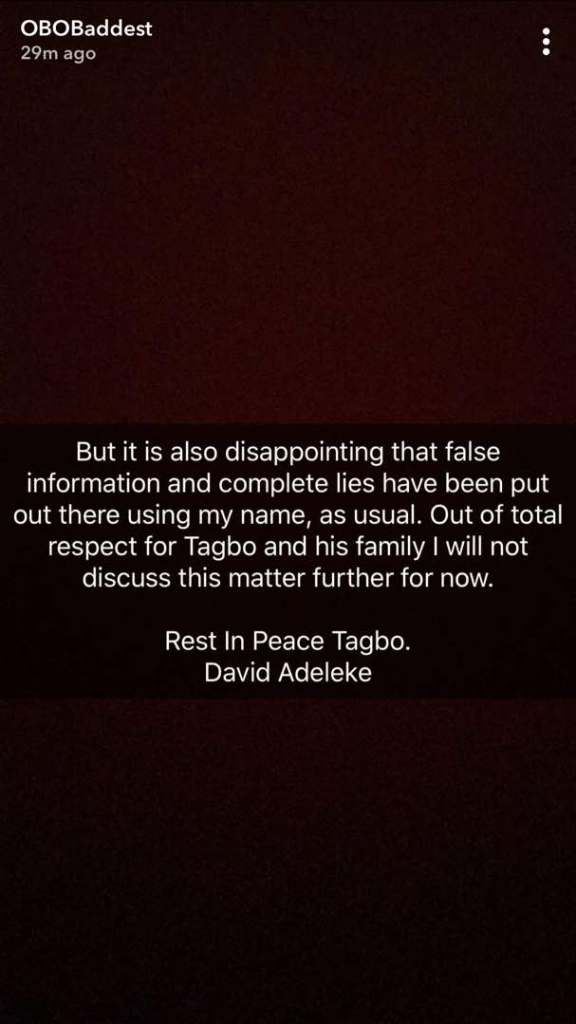 But it is also disappointing that false information and complete lies have been out there using my name, as usual. Out total respect for Tagbo and his family, I will not discuss this matter further for now.